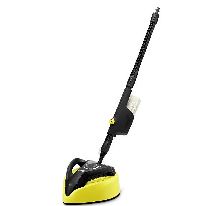Terrassevaskeren T-Racer T 550 rengjør store flater utendørs raskt og effektivt uten vannsprut. En terrassevasker flyter lett over underlaget, er enkel å bruke, og opptil 50 % raskere enn ved bruk av vanlig strålerør. Med T-Racer T 550 kan trykket justeres optimalt ved å endre avstand til underlaget. Dette innebærer at både harde overflater som stein og betong, og mer sensitive overflater som tre kan rengjøres med T 550. Ergonomisk håndtak som gjør det enklere å rengjøre vertikale flater som f.eks. garasjeporter. Med T 550 kan du også påføre rengjøringsmiddel under rengjøringen, og justere mengden underveis. Plug'n' Clean systemet gjør at brukeren enkelt kan bytte mellom ulike rengjøringsmidler. T 550 er utstyrt med ekstra kraftdyse for rengjøring i hjørner og kanter. Bytte til kraftdysen gjøres ved å trå på en fotpedal. T-Racer T 550 er egnet for Kärcher Home & Garden høytrykkspylere.