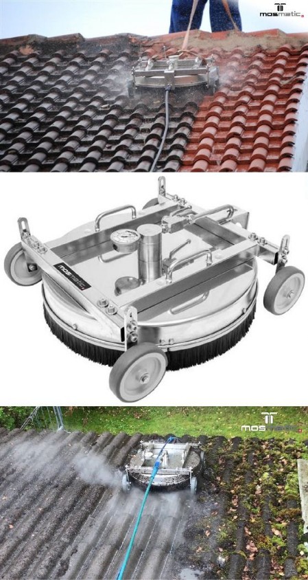 Et industrielt kvalitetsverktøy til effektiv og dyptgående rengjøring av tak og overflater. DR-520 Takvaskeren er laget i rustfritt stål som sikrer god kvalitet og lang levetid. Mosmatic Overflatevasker har også fokus på sikkerhet og stabilitet; som vist på bildet kan brukeren stå trygt på den ene siden av taket mens takvaskeren kan kjøre opp og ned på den andre siden av taket.